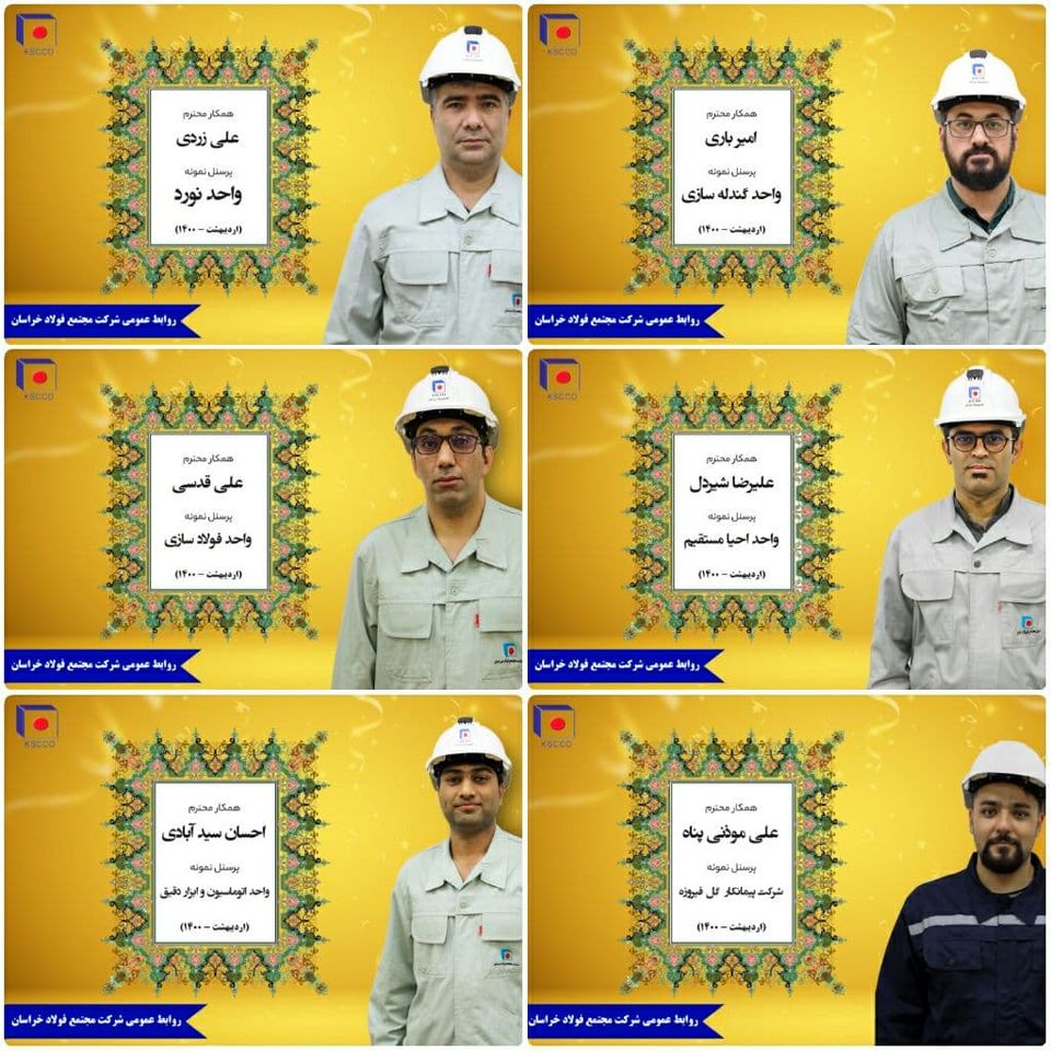 بر اساس این فهرست، آقایان: امیر باری (کارخانه گندله سازی)، علیرضا شیردل (کارخانه احیا مستقیم)، احسان سیدآبادی (مدیریت اتوماسیون و ابزار دقیق)، علی زردی (کارخانه نورد)، علی قدسی (کارخانه فولادسازی) و علی موذنی پناه (از شرکت پیمانکاری «گل فیروزه») به عنوان کارکنان نمونه شرکت در ماه گذشته برگزیده شده اند.
