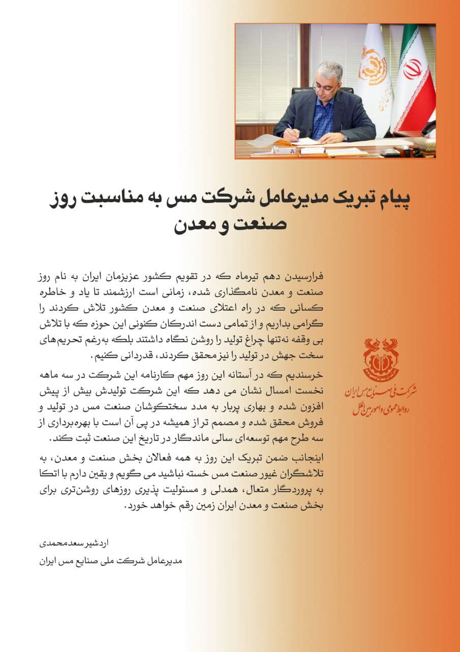 اینجانب ضمن تبریک این روز به همه فعالان بخش صنعت و معدن، به تلاشگران غیور صنعت مس خسته نباشید می گویم و یقین دارم با اتکا به پروردگار متعال، همدلی و مسئولیت پذیری روزهای روشنتری برای بخش صنعت و معدن ایران زمین رقم خواهد خورد.