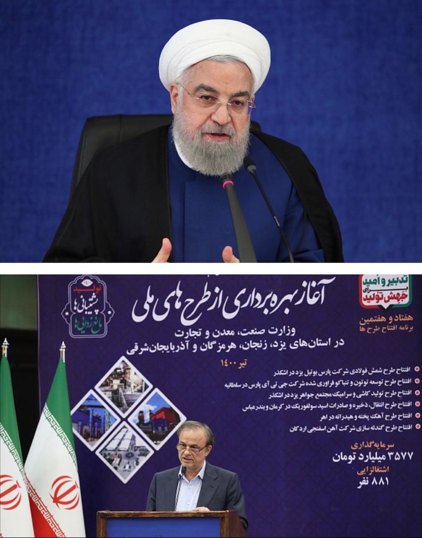 طرح شمش فولادی پارس بوتیل یزد در اشکذر، طرح توسعه توتون و تنباکو فراوری شده شرکت جی تی آی پارس سلطانیه، طرح تولید کاشی و سرامیک جواهر یزد در اشکذر، طرح انتقال و ذخیره صادرات اسید سولفوریک در کرمان و بندرعباس، طرح آهک پخته و هیدراته در اهر و طرح گندله سازی شرکت آهن اسفنجی اردکان طرح هایی بودند که با دستور رئییس جمهور مورد بهره برداری قرار گرفتند.