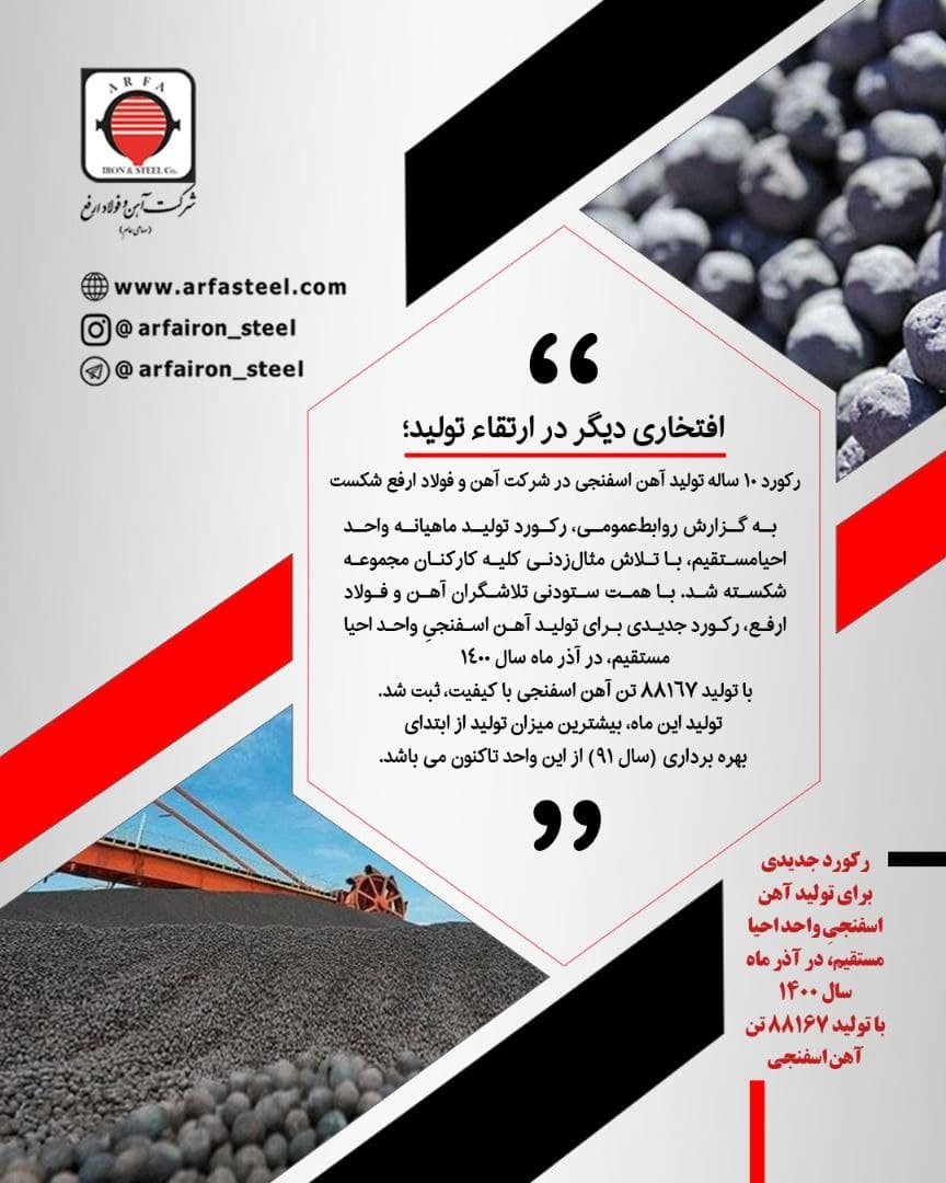 به گزارش بیرونیت به نقل از روابطعمومی شرکت آهن و فولاد ارفع، با همت ستودنی تلاشگران آهن و فولاد ارفع، رکورد جدیدی برای تولید آهن اسفنجیِ واحد احیا مستقیم، در آذر ماه سال ۱۴۰۰ با تولید ۸۸۱۶۷ تن آهن اسفنجی با کیفیت، ثبت شد.