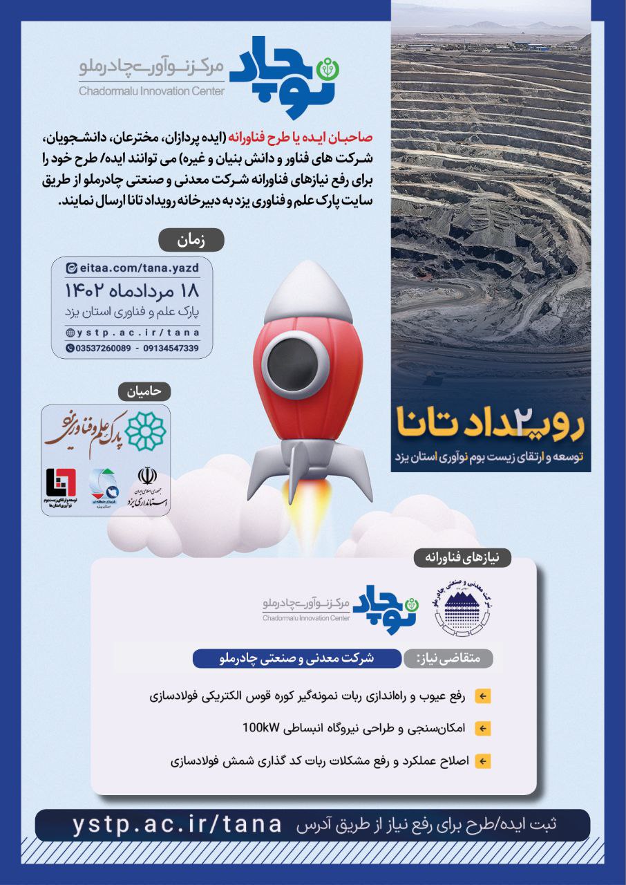 به گزارش بیرونیت، صاحبان ایده یا طرح فناورانه (ایده پردازان، مخترعان، دانشجویان، شرکت های فناور و دانش بنیان و غیره) می توانند ایده/ طرح خود را برای رفع نیازهای فناورانه شرکت معدنی و صنعتی چادرملو، از طریق سایت پارک علم و فناوری یزد به آدرس زیر به دبیرخانه رویداد تانا ارسال نمایند.