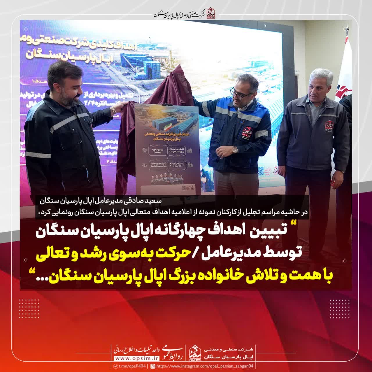مدیر عامل شرکت اپال پارسیان سنگان تاکید کرد: این اهداف تنها بر روی کاغذ نیستند؛ بلکه در عزم، دانش و تلاش شبانهروزی شما معنا پیدا میکنند. هر گام کوچک در مسیر تحقق این اهداف، بخشی از حرکت بزرگ ما بهسوی آیندهای روشنتر است. باور دارم که با همدلی، پشتکار و روحیهی سازندگی خانوادهی اپال پارسیان سنگان، این مسیر با موفقیت طی خواهد شد و ثمرات آن نهتنها برای سازمان، بلکه برای جامعه و کشور عزیزمان ماندگار خواهد بود.
