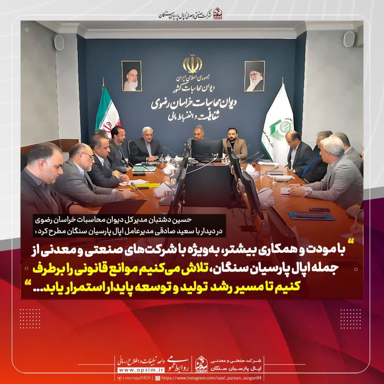 در ادامه، آقای دشتبان مدیرکل دیوان محاسبات استان نیز با تأکید بر ضرورت همکاری و همافزایی بین شرکت های صنعتی و معدنی منطقه گفت: با مودت و همکاری بیشتر، بهویژه با شرکتهای صنعتی و معدنی از جمله اپال پارسیان سنگان، تلاش میکنیم موانع قانونی را برطرف کنیم تا مسیر تولید، توسعه استمرار یابد.