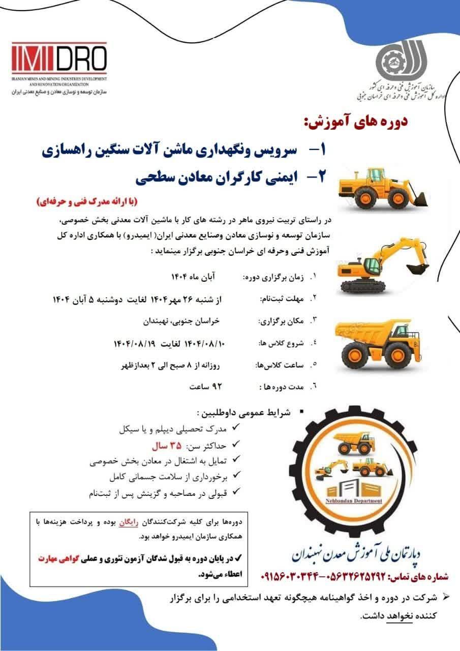 این دورههای آموزشی از ۱۰ تا ۱۹ آبانماه ۱۴۰۴ در دپارتمان ملی آموزش معدن نهبندان (استان خراسان جنوبی) بهصورت رایگان برگزار میشوند.