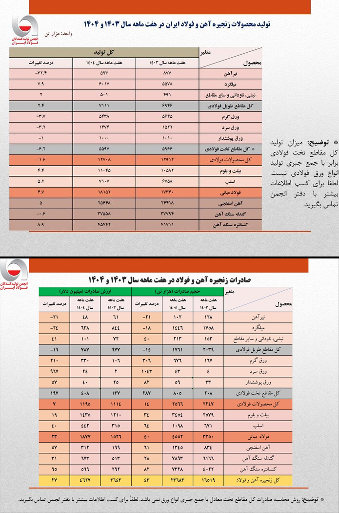 کاهش تولید تیرآهن در هفت ماهه ۱۴۰۴ نسبت به مدت مشابه ۱۴۰۳ (۳۲.۴- درصد) بیشتر از سایر محصولات زنجیره فولاد قابلتوجه بوده است.