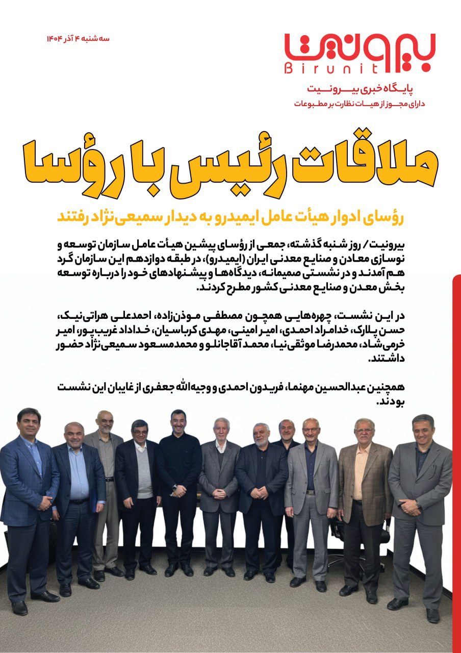 بیرونیت/ روز شنبه گذشته، جمعی از رؤسای پیشین هیأت عامل سازمان توسعه و نوسازی معادن و صنایع معدنی ایران (ایمیدرو)، در طبقه دوازدهم این سازمان گرد هم آمدند و در نشستی صمیمانه، دیدگاه‌ها و پیشنهادهای خود را درباره توسعه بخش معدن و صنایع معدنی کشور مطرح کردند.