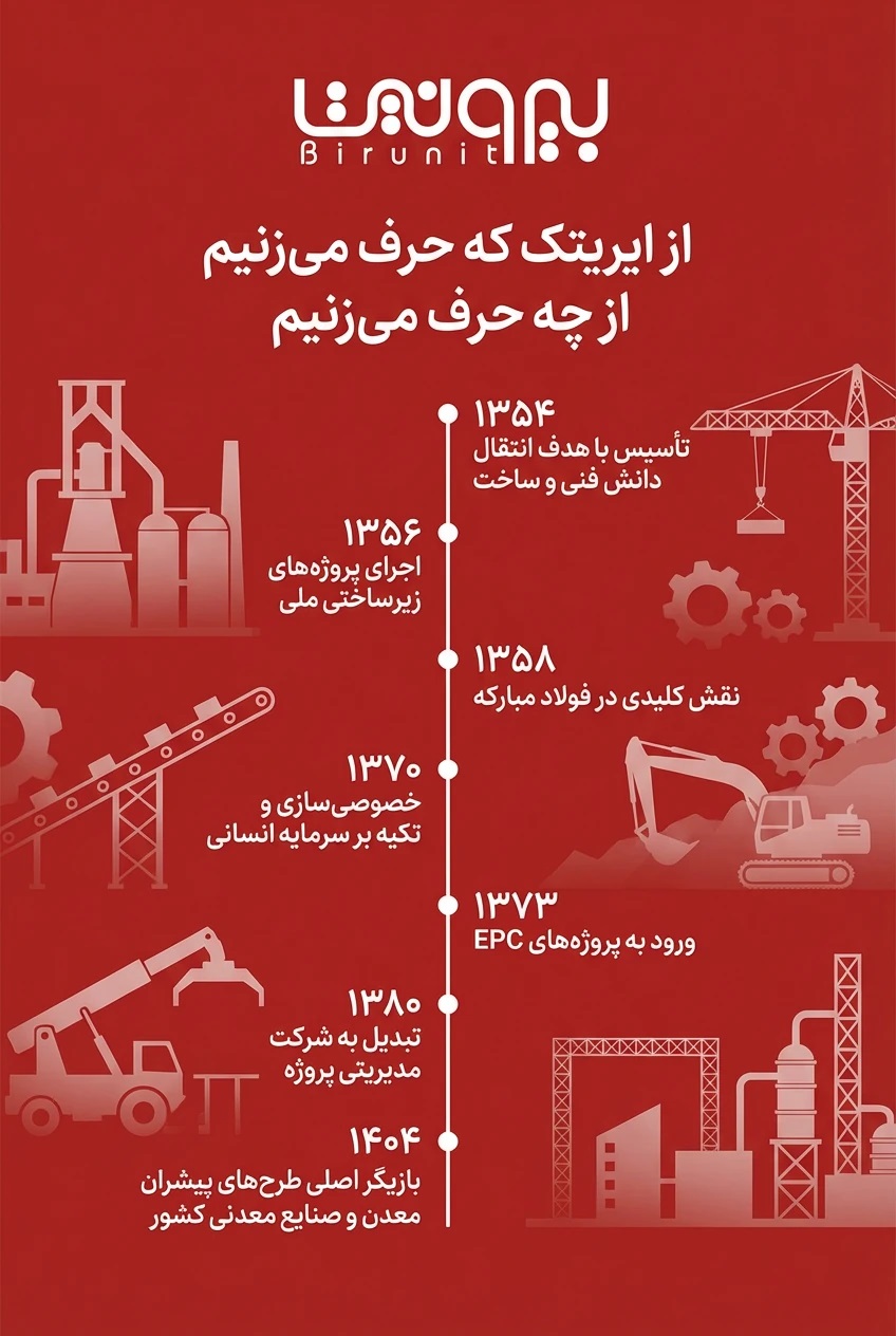 در این پیام آمده است: ایریتک طی پنج دهه فعالیت مستمر، با تکیه بر کار تیمی، تعهد سازمانی و باور به توان مهندسی داخلی، توانسته است در اجرای پروژههای صنعتی نقشآفرینی مؤثری داشته و سهم قابل توجهی در توسعه مهندسی و زیرساختهای کشور ایفا کند.
