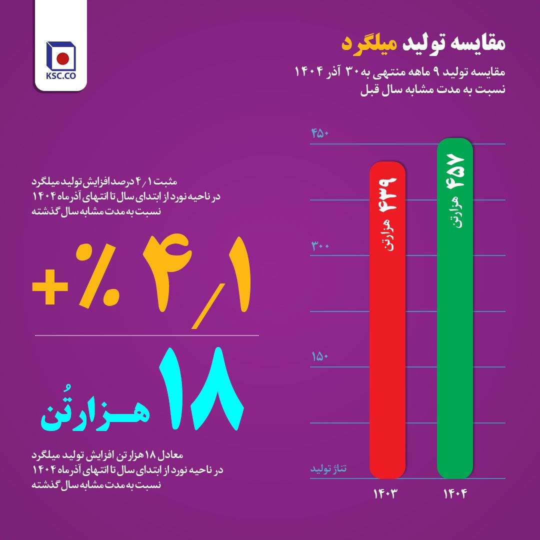 در ناحیه نورد نیز تولید محصولات نهایی از ۴۳۹ هزار تن در ۹ ماهه سال گذشته به ۴۵۷ هزار تن در سال جاری افزایش یافته است؛ رشدی معادل ۱۸ هزار تن که نشاندهنده افزایش حدود ۴.۱ درصدی تولید در انتهای زنجیره است.