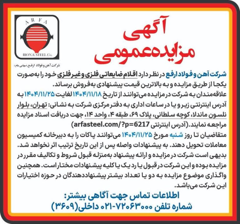 به گزارش بیرونیت به نقل از روابط عمومی شرکت آهن و فولاد ارفع، علاقه مندان به شرکت در مزایده میتوانند از تاریخ ۱۴۰۴٫۱۱٫۱۸ لغایت ۱۴۰۴٫۱۱٫۲۵ به آدرس اینترنتی https://arfasteel.com/?p=6217 و یا در ساعات اداری به دفتر مرکزی شرکت به نشانی تهران بلوار نلسون ماندلا کوچه سلطانی، پلاک ۶۹ طبقه ۴ واحد ۱۴ جهت دریافت اسناد مزایده مراجعه نمایند.